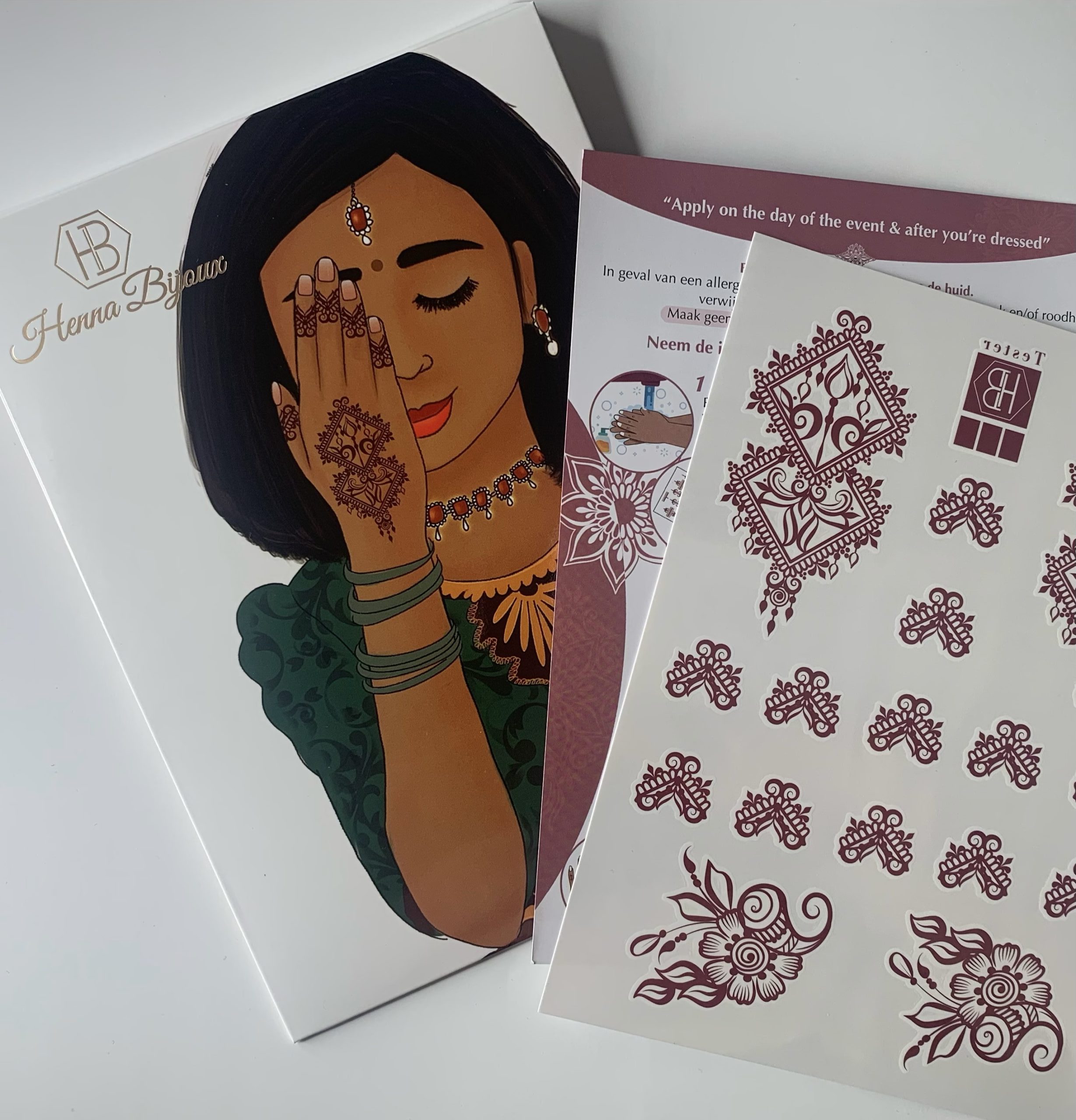Elk verpakking bevat 1 Henna Bijoux, voor zowel de linker- als rechterhand, en een uitgebreide gebruiksaanwijzing met tips voor nazorg. Daarnaast zitten er extra designs voor de vingers bij. De Henna Bijoux is geschikt voor de buitenzijde van de hand, zoals weergegeven op de verpakking afbeelding.